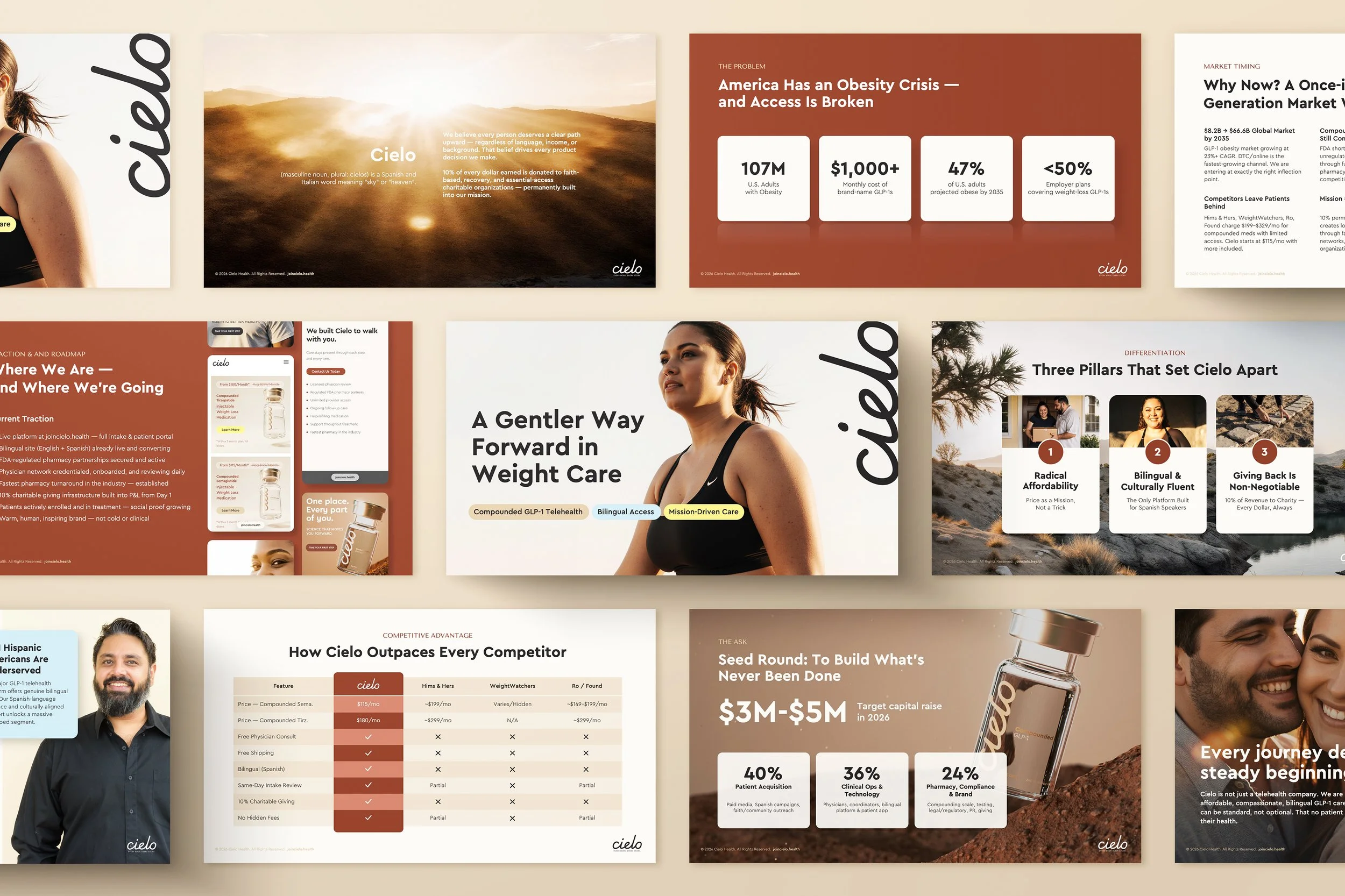 Cielo needed a compelling investor pitch—fast. With just 24 hours to deliver, the existing presentation lacked both structure and personality, relying on a generic template that didn’t reflect the brand’s mission of providing affordable, compassionate, bilingual GLP-1 care.